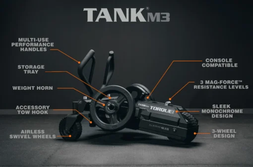 Experience a new level of sled-based training with the Tank M3 Push Sled — engineered for performance, versatility, and ease of use. Its three-wheeled design glides smoothly across turf, rubber, concrete and more. With Mag-Force™ magnetic resistance, the harder you push, the more resistance you get — no weight plates required. This makes it perfect for HIIT, conditioning, team training, or rehab environments.