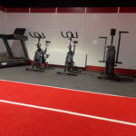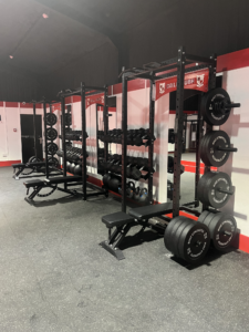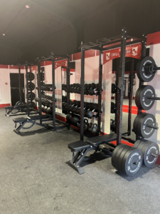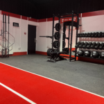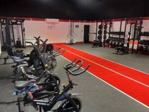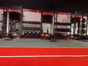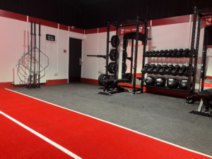 - Central Red-Lined Astro Turf Track: A high-durability synthetic turf lane running through the heart of the gym. This provides a dedicated zone for sled pushes, lunges, and plyometric drills while reinforcing the club’s color scheme.