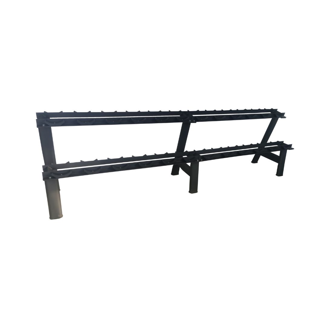 2-tier rack for dumbbells. Durable and stable construction. Resistant powder coating. Your dumbbells will also be protected better as they are not at risk of the rough treatment they would receive if they were just stored on the ground.