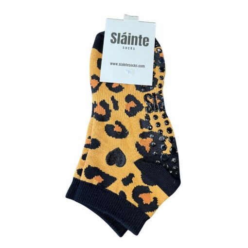 Inspired by the wild beauty of the Irish spirit, the Sláinte “Luxe Leopard” Grip Socks blend untamed energy with refined elegance. Featuring a bold leopard print, accented with a delicate embroidered black heart and a sleek solid black cuff, this design celebrates strength and grace in perfect balance.