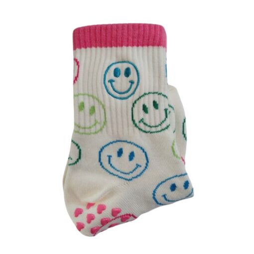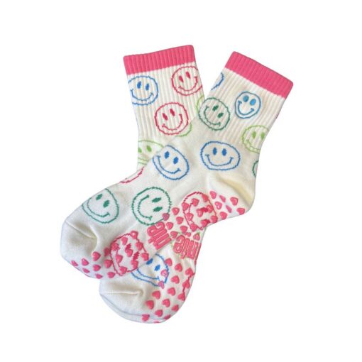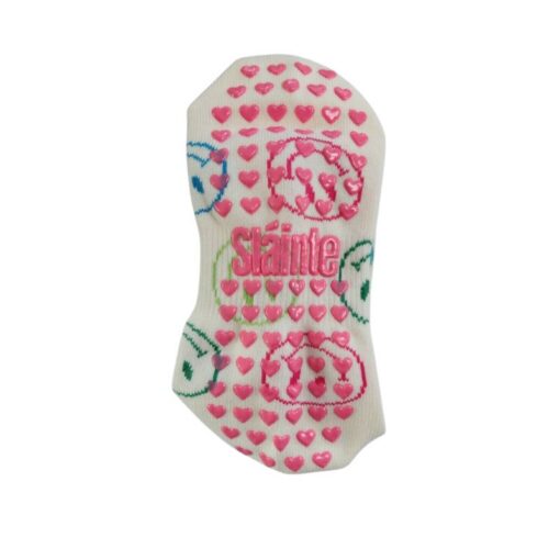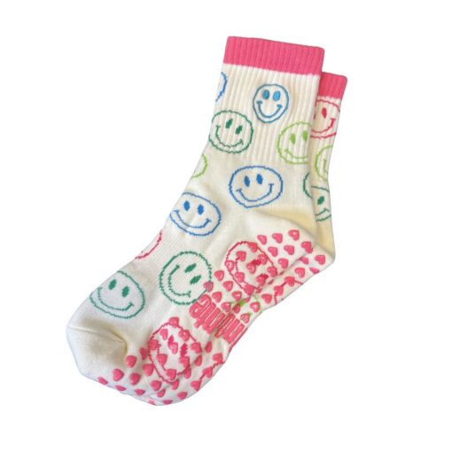 Inspired by the Irish word for happiness, these grip socks bring joy to every movement. Featuring a cheerful smiley pattern and a delicate embroidered smiley face, softened with chic pink accents, they add a playful yet elevated touch to your practice.